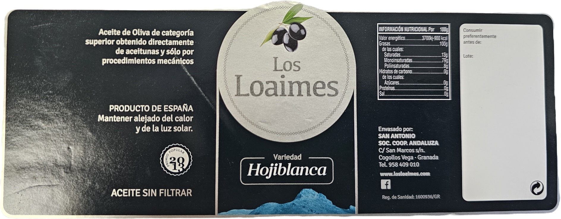 Aove virgen extra monovarietal de HOJIBLANCA, sin filtrar, de cosecha temprana 2025/2026, con una acidez máxima de 0.13º. Siendo un aceite frutado, verde hierba, aromático, dulce, para finalizar con un ligero toque picante en garganta y regusto final almendrado.